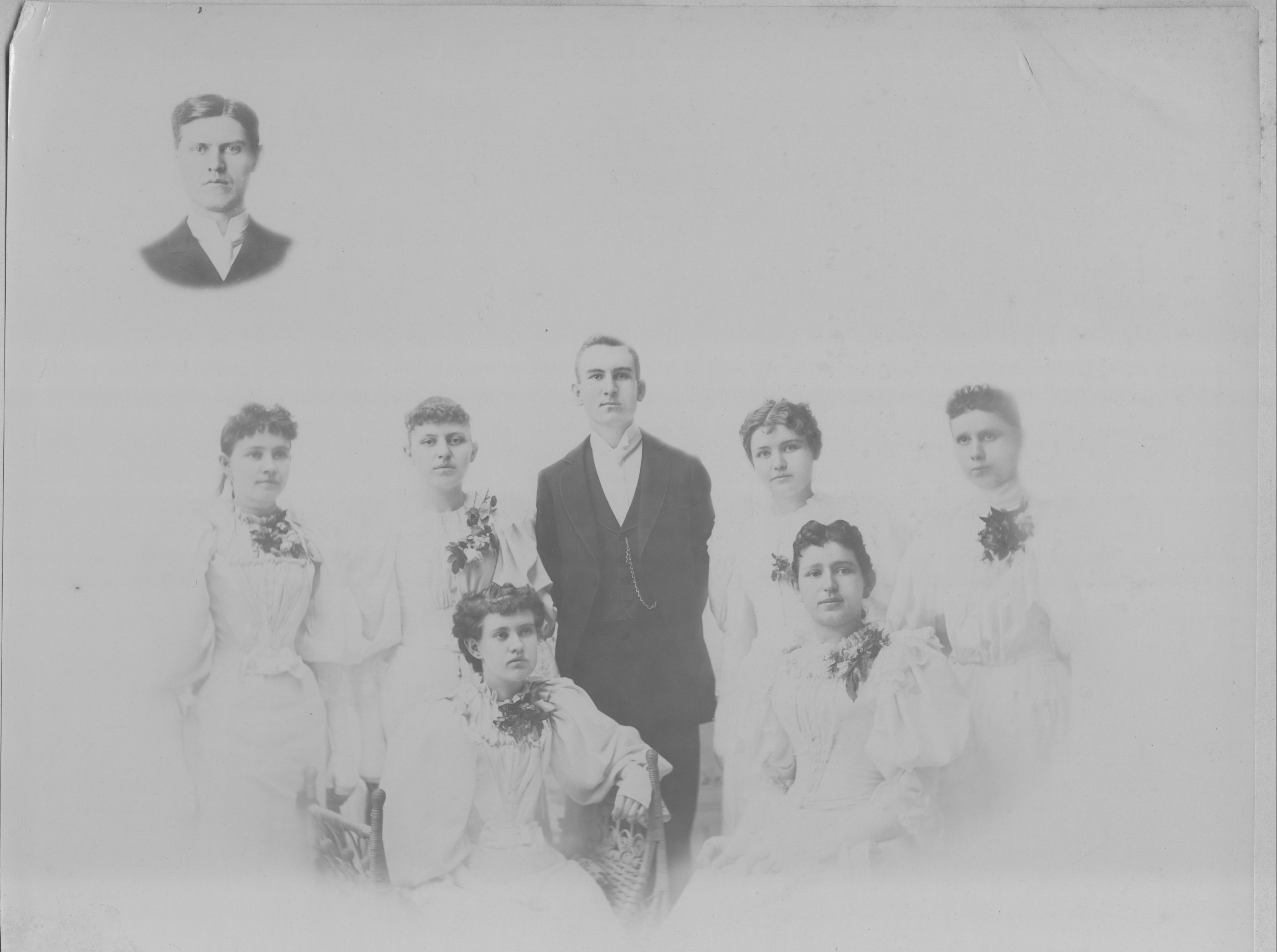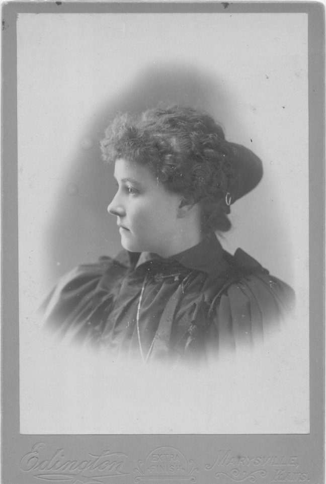 Marysmith K. H. S. Graduating Class, 1894. Gertrude Shumway, Myrtle Shumway, Mima Hahn (sp?), Annie Bull, Grace Barnes, Etta Benson, Marion Laycock (bay), Mr. Star, Superintendent. NOTE: Names do not match order in photograph |